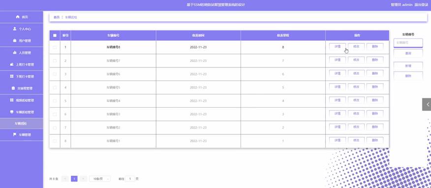 管理员进入主页面,主要功能包括对首页、个人中心、用户管理、人员管理、上班打卡管理、下班打卡管理、交接班管理、视频巡检管理、车辆巡检管理、车辆管理等进行操作。管理员主页面如图5-2所示: