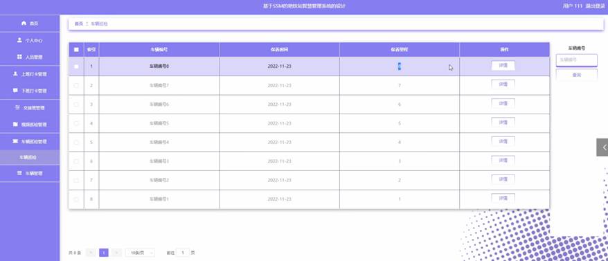 用户点击车辆巡检管理,然后页面跳转到车辆巡检管理界面对车辆编号、保养时间、保养里程等信息,可以查询车辆巡检等操作。如图5-15所示: