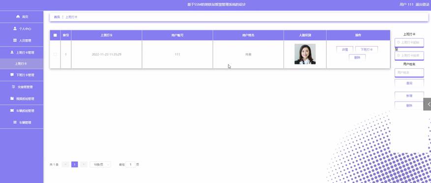 用户点击上班打卡管理,然后页面跳转到上班打卡管理界面对上班打卡、用户账号、用户姓名、人脸识别等信息,可以查询,新增或删除上班打卡等操作。如图5-12所示:
