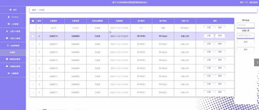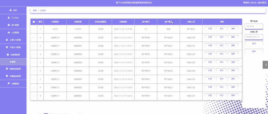 管理员点击交接班管理。然后页面跳转到交接班管理界面输入交接班次、交接类型、任务完成情况、交接时间、用户账号、用户姓名、交接人员等信息,可以查询,新增或删除交接班信息等操作。如图5-6所示: