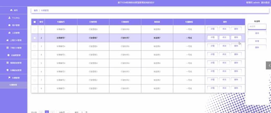 - 车辆信息维护:录入车辆基础信息(行驶里程、行驶时间、制造商、路线),管理员跟踪车辆运行状态,优化保养与调度计划,延长车辆使用寿命;