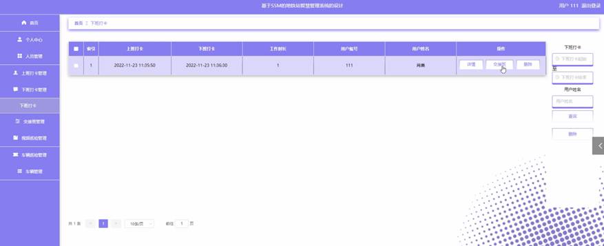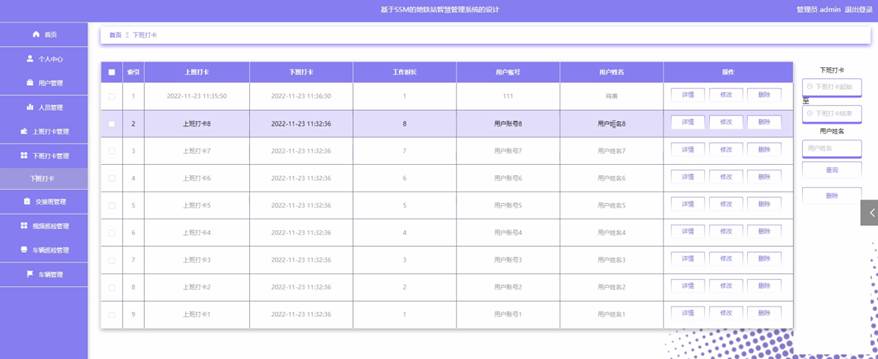 用户点击下班打卡管理,然后页面跳转到下班打卡管理界面对上班打卡、下班打卡、工作时长、用户账号、用户姓名等信息,可以查询或删除下班打卡等操作。如图5-13所示: