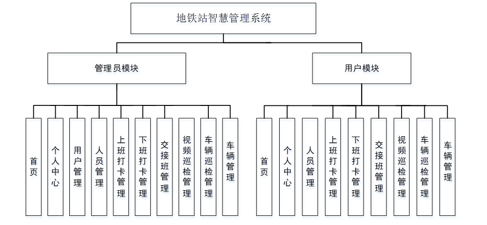 - 系统运营管理:管理员维护系统配置(参数设置、权限分配),监控系统运行状态,通过数据统计(考勤率、巡检完成率)优化管理策略,保障地铁站运营稳定;