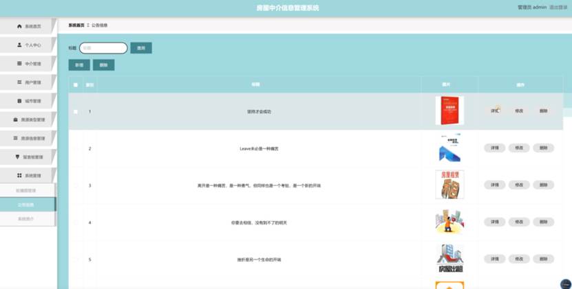 管理员点击系统管理。在公告信息页面输入标题进行查询、新增或删除公告信息列表,并根据需要对公告信息详情信息进行详情、修改或删除操作;还可以对轮播图管理、系统简介进行相应操作;如图5-13所示: