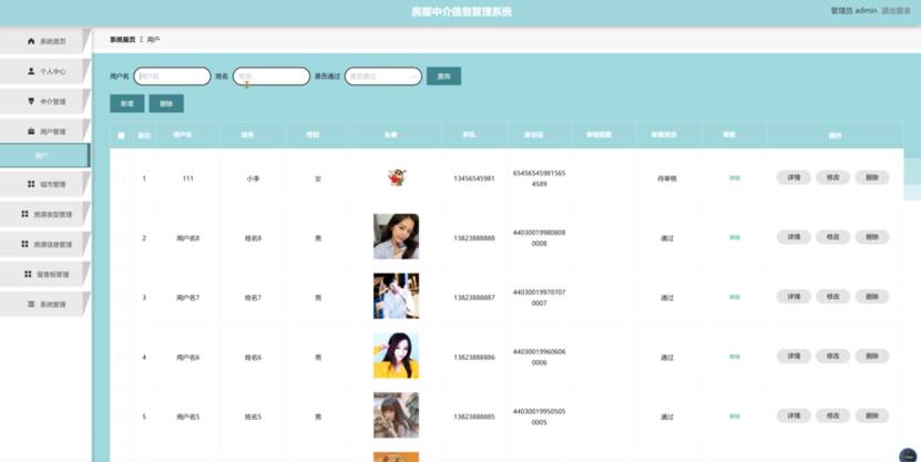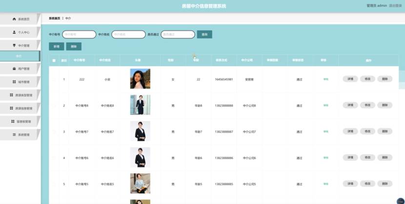 管理员点击中介管理。在中介页面输入中介账号、中介姓名和选择是否通过进行查询、新增或删除中介列表,并根据需要对中介详情信息进行详情、修改或删除操作;如图5-7所示: