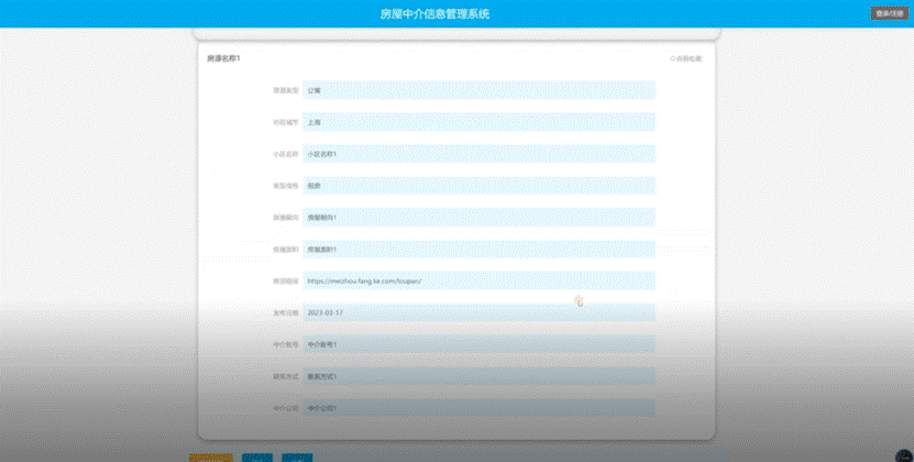 房源信息:在房源信息页面的输入栏中输入房源名称、房源类型、所在城市、小区名称、类型信息、房屋朝向、房屋面积、房屋链接、发布日期、中介账号、联系方式、中介公司进行查询,可以查看到房源详细信息,并根据需要进行评论、地图或收藏操作;房源信息页面如图5-3所示: