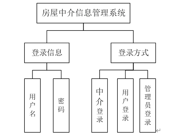 系统启动后,在登录界面,输入正确的账号密码,选择进入管理员界面或用户界面、中介界面,管理员界面是用来管理页面与中介信息、用户信息,用户界面可以正常的使用,并对首页、中介、房源信息、公告信息、留言板、个人中心等进行份内的操作,中介界面可以正常的使用,并对系统首页、个人中心、房源信息管理等进行份内的操作,系统登录结构图如图4-1所示。