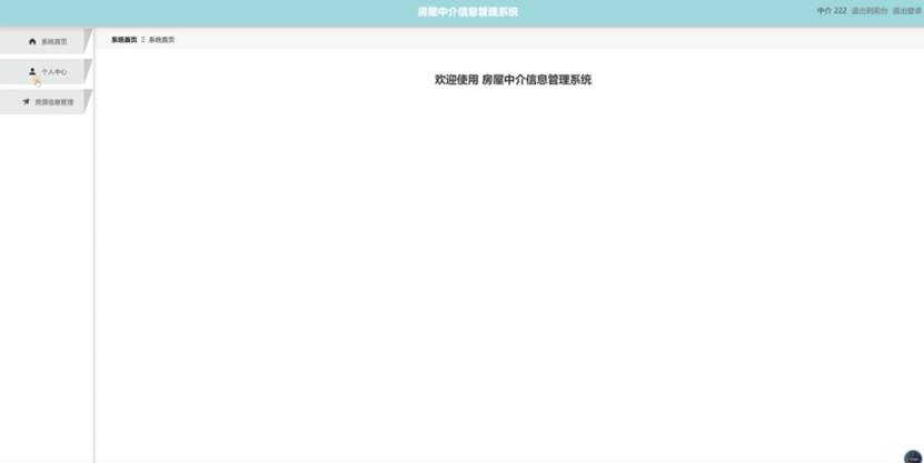 中介进入主页面,主要功能包括对系统首页、个人中心、房源信息管理等进行操作。中介主页面如图5-14所示:
