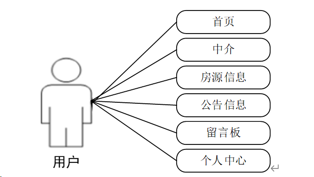 (2)、用户关键功能包含首页、中介、房源信息、公告信息、留言板、个人中心等进行管理。用户用例如下: