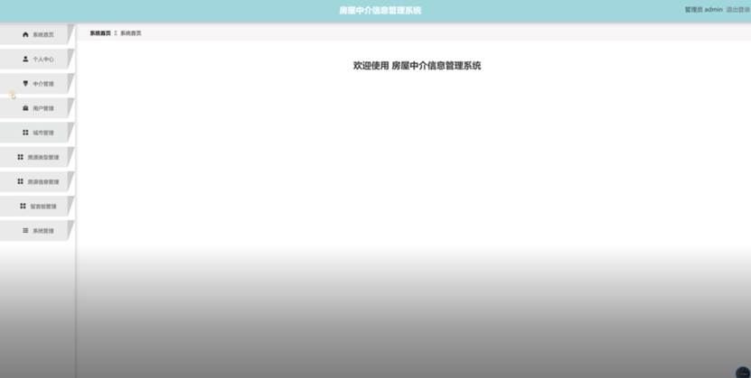 管理员进入主页面,主要功能包括对系统首页、个人中心、中介管理、用户管理、城市管理、房源类型管理、房源信息管理、留言板管理、系统管理等进行操作。管理员主页面如图5-6所示: