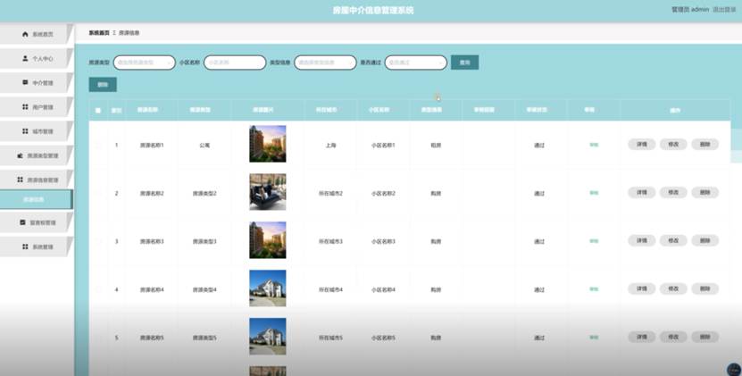 管理员点击房源信息管理。在房源信息页面输入房源类型、小区名称、类型信息和选择是否通过进行查询、新增或删除房源信息列表,并根据需要对房源详情信息进行详情、修改或删除操作;如图5-11所示: