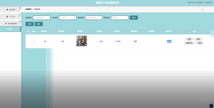 中介点击房源信息管理。在房源信息页面输入房源类型,、小区名称、类型信息和选择是否通过进行查询、新增或删除房源信息列表,并根据需要对房源信息详情信息进行详情、修改、查看评论或删除操作;如图5-15所示: