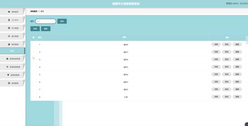 管理员点击城市管理。在城市页面输入城市进行查询、新增或删除城市列表,并根据需要对城市详情信息进行详情、修改或删除操作;如图5-9所示: