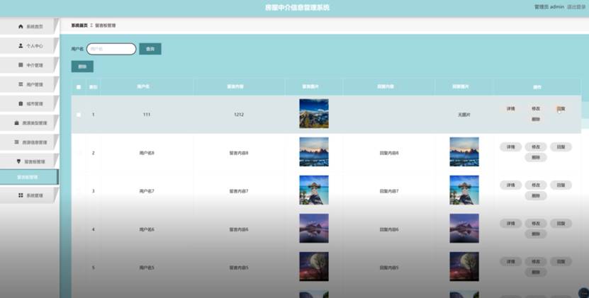 管理员点击留言板。在留言板页面输入用户名进行查询或删除留言板列表,并根据需要对留言板详情信息进行详情、修改、回复或删除操作;如图5-12所示: