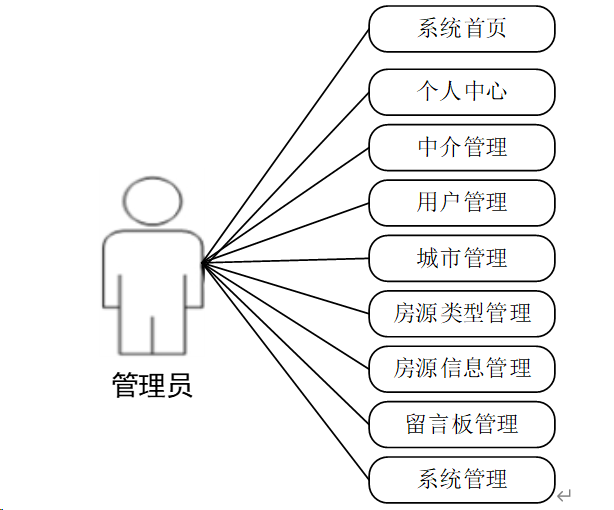 (1)、管理员关键功能包含系统首页、个人中心、中介管理、用户管理、城市管理、房源类型管理、房源信息管理、留言板管理、系统管理等进行管理。管理员用例如下: