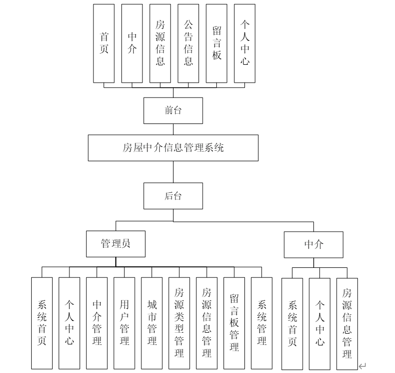 管理员模块属于是网站的后台,进入之后有大量的管理员功能,管理员也可以使用用户模块和中介模块的功能,为了维护网站的稳定与页面的布局,将管理员模块的功能详细化后可以使用系统管理对页面进行布局修改,可以发布公告提示中介和用户规范,中介和用户模块只可以修改个人信息,对房源信息等进行查询,修改、查看评论或删除等,房屋中介信息管理系统总体结构图如图4-2所示。