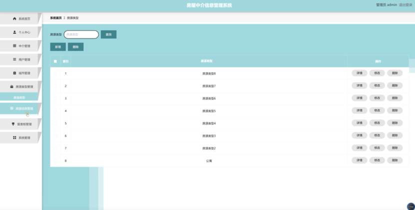 管理员点击房源类型管理。在房源类型页面输入房源类型进行查询、新增或删除房源类型列表,并根据需要对房源类型详情信息进行详情、修改或删除操作;如图5-10所示:
