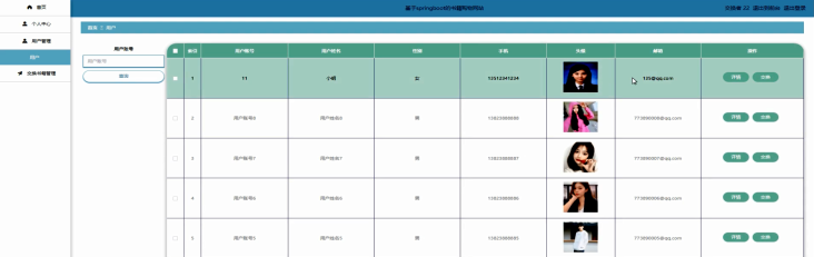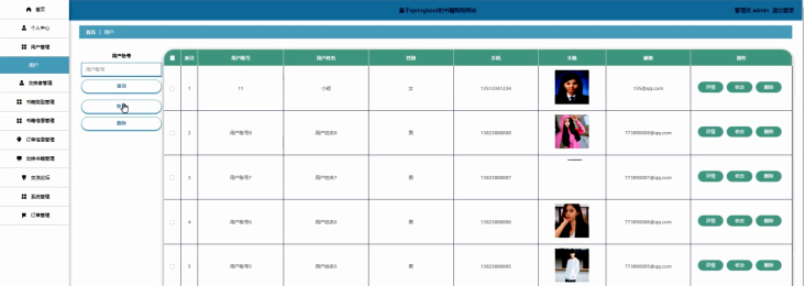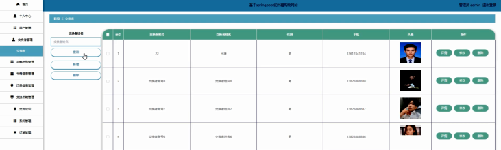 管理员点击用户管理,进入用户管理页面,可以通过输入账号和姓名进行查询的操作,还能对用户信息进行新增、修改或删除等操作;管理员还可以管理交换者信息,可以对交换者信息进行查询、新增、修改、删除等操作,具体操作页面如下图所示: