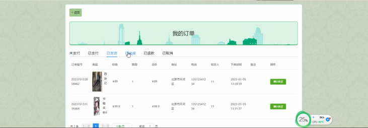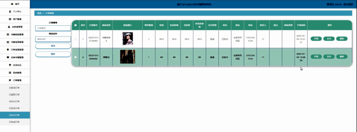 管理员点击订单管理,进入订单管理页面,管理员可以对已取消订单、已退款订单、未支付订单、已发货订单、已支付订单、已完成订单等详细操作。具体操作页面如图5-15所示: