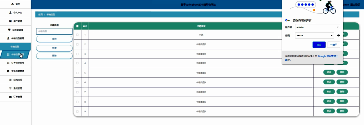 管理员点击书籍类型管理,进入书籍类型管理页面,可以通过输入书籍类型进行查询的操作,还可以进行新增、修改或删除等操作。具体操作页面如图5-10所示:
