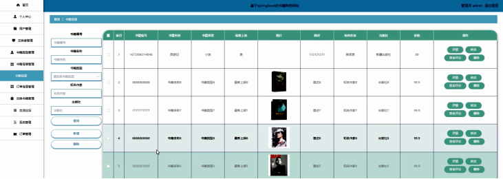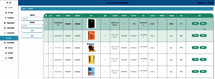 管理员点击订单信息管理,进入订单信息管理页面,通过输入书籍名称、是否通过可以进行查询的操作,还能对订单信息进行在线审核、查看详情或删除等操作。具体操作如下图所示: