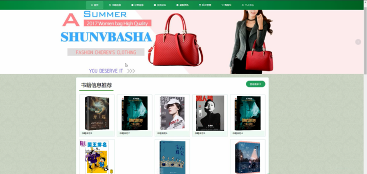 当用户打开系统的网址后,首先看到的就是首页界面。在这里,用户能够看到书籍购物网站的导航条(首页、书籍信息、订单信息、交流论坛、最新资讯、后台管理、购物车、个人中心)和书籍信息推荐等。系统首页界面如图5-2所示: