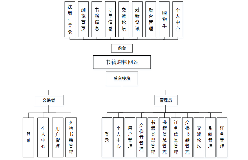 书籍购物网站按照权限的类型进行划分,分为用户、交换者、管理员三个模块。管理员模块主要针对整个系统的管理进行设计,提高了管理的效率和标准。系统的总体模块设计如下图所示: