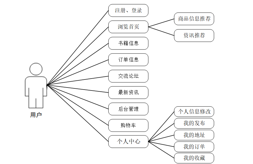 (1)、用户关键功能包含用户注册登录,查看书籍信息、订单信息、交流论坛、最新资讯、后台管理、购物车、个人中心等有关信息,并进行详细操作。用户用例如下: