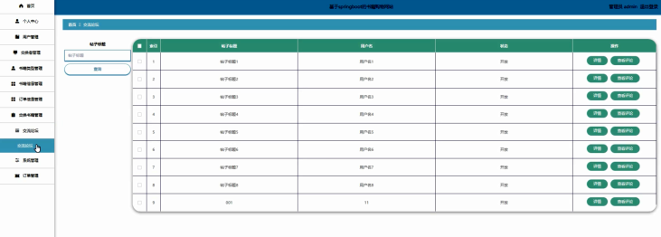 管理员点交流论坛,进入交流论坛页面,可以浏览交流论坛详情,并进行查询、查看详情、查看评论、回复评论等操作;交流论坛界面如图5-13所示: