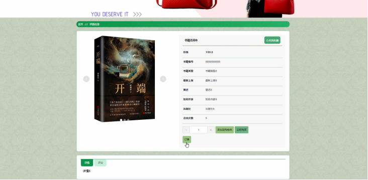 在书籍信息页面的输入栏中输入书籍编号、书籍名称、书籍类型、知名作家、出版社等进行查询的操作,进入书籍信息页面可以查看书籍信息详情,并进行添加到购物车、立即购买、添加订单信息、评论或收藏操作,具体操作页面如下图所示: