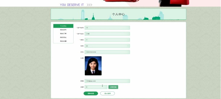 点击个人中心,用户在个人中心页面可以更新个人信息、充值余额,还可以对我的发布、我的订单、我的地址和我的收藏内容进行详细操作;具体操作页面如下图所示: