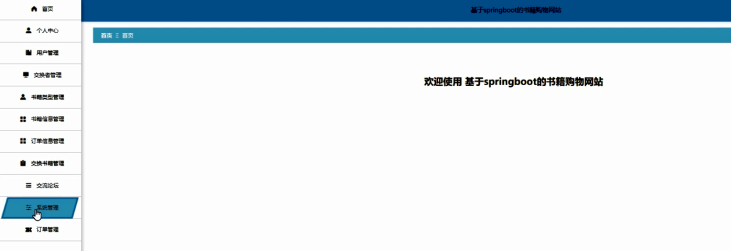 管理员进入主页面,主要包括对个人中心、用户管理、交换者管理、书籍类型管理、书籍信息管理、订单信息管理、交换书籍管理、交流论坛、系统管理、订单管理等进行操作。管理员主页面如图5-8所示: