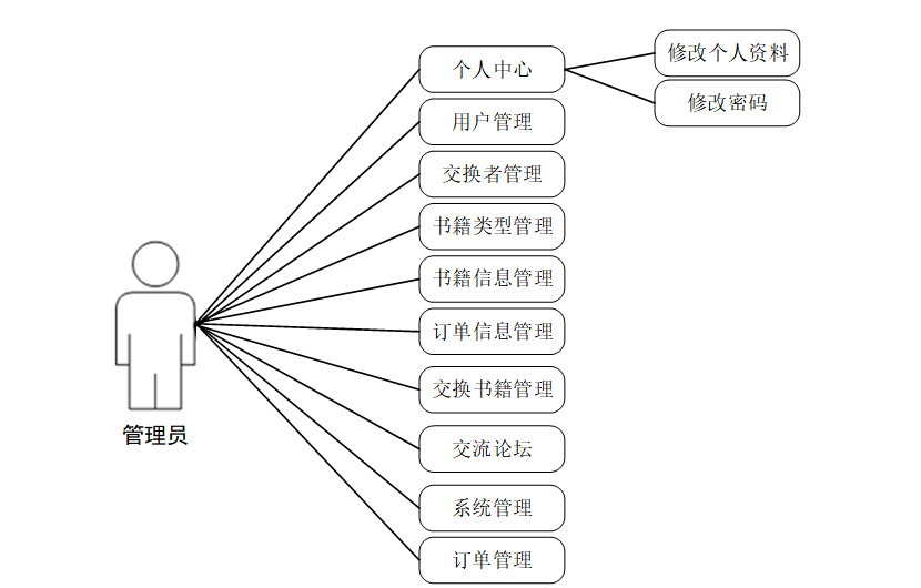 (2)、管理员的功能是最高的,可以对系统所有功能进行管理,包括对个人中心、用户管理、交换者管理、书籍类型管理、书籍信息管理、订单信息管理、交换书籍管理、交流论坛、系统管理、订单管理的管理。管理员用例如下: