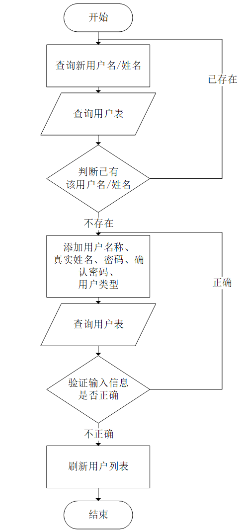 添加新用户的流程是先查询新用户名是否已存在,如已有该用户名,需重拟用户名并同时输入新用户的其它信息,添加新用户到数据库时会先验证数据是否完整,信息都正确且完整时,返回并刷新用户列表;信息不正确时,会返回输入信息的那一步。该流程如下图所示。
