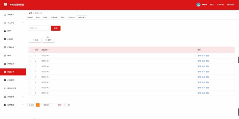 管理员点击商品分类。在商品分类页面输入商品分类进行查询、新增或删除商品分类列表,并根据需要对商品分类详情信息进行详情、修改或删除操作;如图5-12所示: