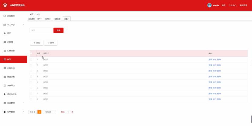 管理员点击类型。在类型页面输入类型进行查询、新增或删除类型列表,并根据需要对类型详情信息进行详情、修改或删除操作;如图5-10所示: