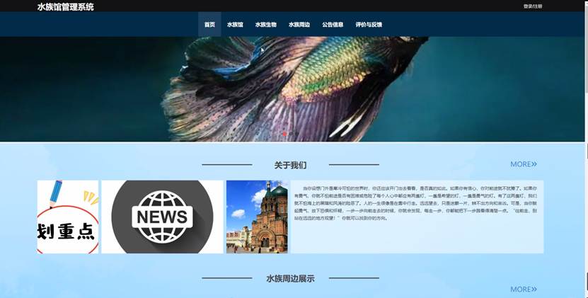 水族馆功能在视图层(view层)进行交互,比如点击“查询、添加或删除”按钮或填写水族馆信息表单。这些水族馆表单动作被视图层捕获并作为请求发送给相应的控制器层(controller层)。控制器接收到这些请求后,调用服务层(service层)以执行相关的业务逻辑,例如验证输入数据的有效性和与数据库的交互。服务层处理完这些逻辑后,进一步与数据访问对象层(DAO层)交互,后者负责具体的数据操作如查看、修改、查看评论或删除水族馆信息,并将操作结果返回给控制器。最终,控制器根据这些结果更新视图层,以便水族馆功能可以看到最新的信息或相应的操作反馈。水族馆界面如图5-8所示: