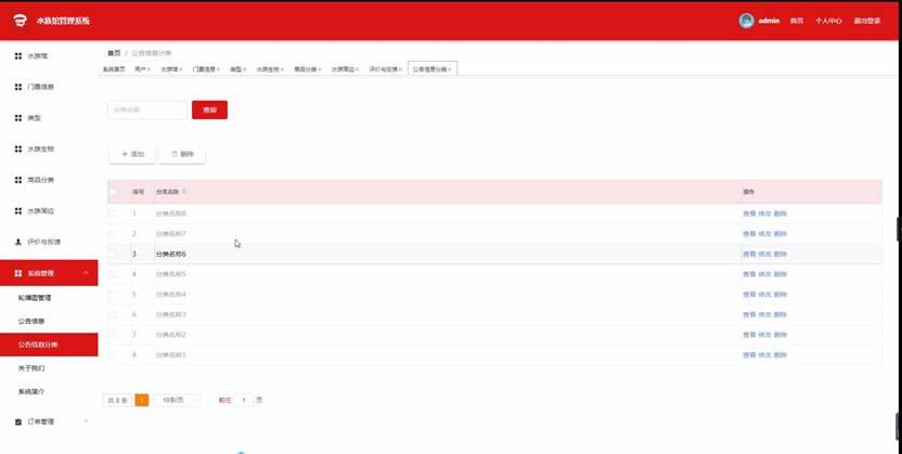 管理员点击系统管理。在公告信息分类页面输入分类名称进行查询、新增或删除公告信息分类列表,并根据需要对公告信息分类详情信息进行详情、修改或删除操作;还可以对轮播图管理、公告信息、关于我们、系统简介进行相应操作;如图5-15所示: