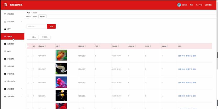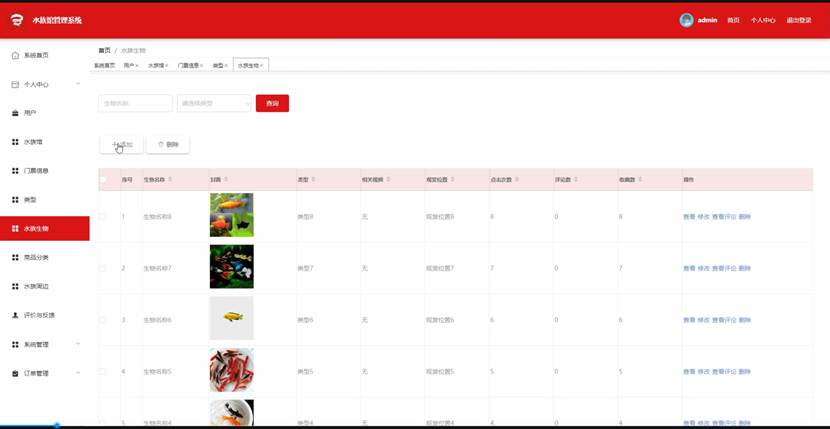 管理员点击水族生物。在水族生物页面输入生物名称和选择类型进行查询、新增或删除水族生物列表,并根据需要对水族生物详情信息进行详情、修改、查看评论或删除操作;如图5-11所示: