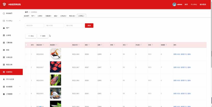 管理员点击水族周边。在水族周边页面输入商品名称、最小价格、最大价格进行查询、新增或删除水族周边列表,并根据需要对水族周边详情信息进行详情、修改、查看评论或删除操作;如图5-13所示: