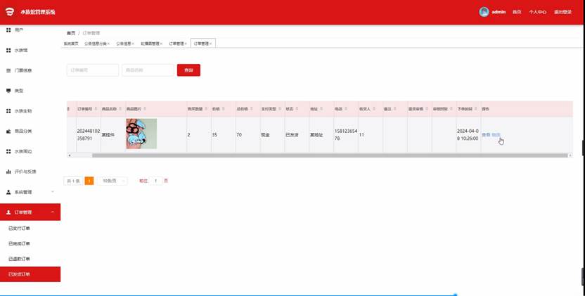 管理员点击订单管理。在已支付订单页面输入订单编号、商品名称进行查询已支付订单列表,并根据需要对已支付订单详情信息进行查看、物流操作;还可以对已完成订单、已退款订单、已发货订单进行相应操作;如图5-16所示: