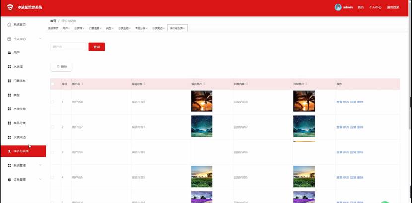 管理员点击评价与反馈。在评价与反馈页面输入用户名进行查询或删除评价与反馈列表,并根据需要对评价与反馈详情信息进行详情、修改、回复或删除操作;如图5-14所示: