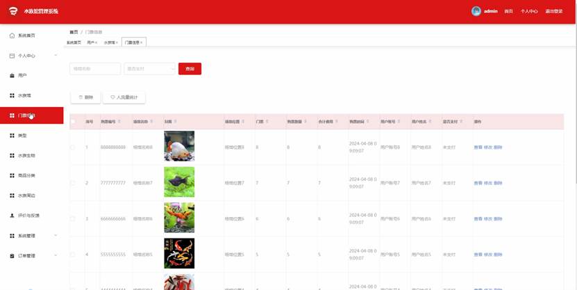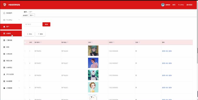 管理员进入主页面,主要功能包括对系统首页、个人中心、用户、水族馆、门票信息、类型、水族生物、商品分类、水族周边、评价与反馈、系统管理、订单管理等进行操作。管理员主页面如图5-6所示: