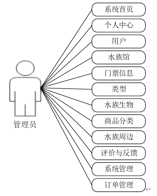 (1)、管理员关键功能包含系统首页、个人中心、用户、水族馆、门票信息、类型、水族生物、商品分类、水族周边、评价与反馈、系统管理、订单管理等进行管理。管理员用例如下: