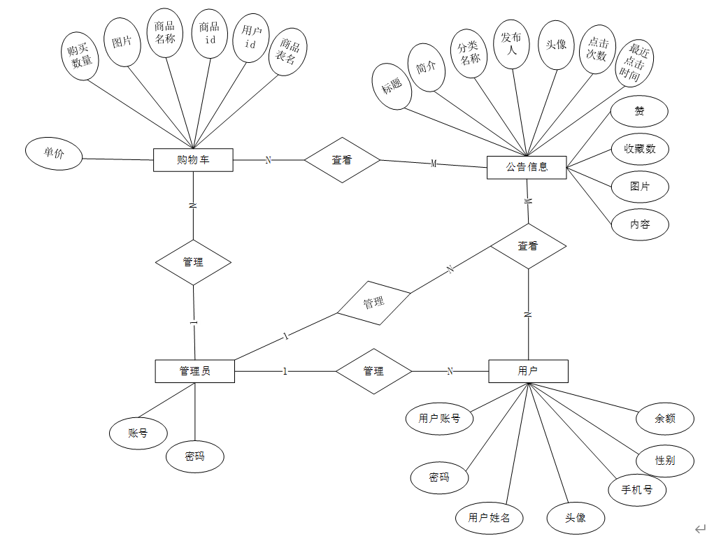 在水族馆管理系统的数据库设计中,系统E-R模型的设计可以展示数据库中各种实体信息和他们之间的关系,将水族馆管理系统的E-R模型研究好后,数据库中数据表的建立也会比较容易。在系统中将“管理员、用户、购物车、公告信息”等作为实体,它们的局部E-R图,如图4-2所示: