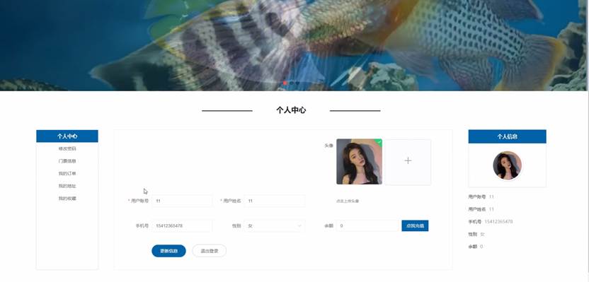 个人中心:在个人中心页面可以对个人中心、修改密码、门票信息、我的订单、我的地址、我的收藏进行详细操作;如图5-4所示: