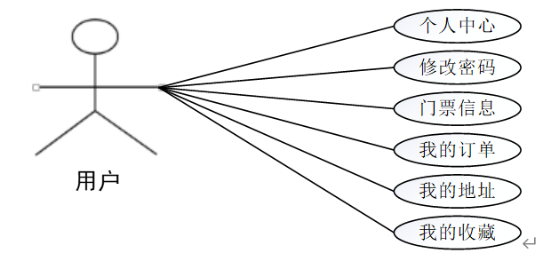 (2)、用户关键功能包含个人中心、修改密码、门票信息、我的订单、我的地址、我的收藏等进行管理。用户用例如下: