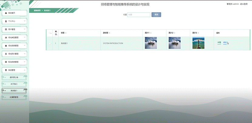 管理员点击系统管理。在系统简介页面输入标题进行查询系统简介列表,并根据需要对系统简介详情信息进行详情或修改操作;还可以对俱乐部公告、关于我们、轮播图管理进行相应操作;如图5-12所示:
