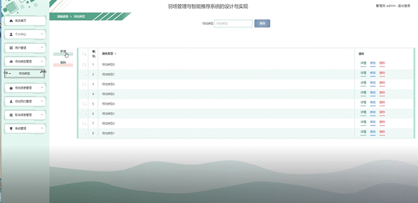 管理员点击场地类型管理。在场地类型页面输入场地类型进行查询、新增或删除场地类型列表,并根据需要对场地类型详情信息进行详情、修改或删除操作;如图5-8所示: