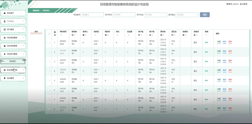 管理员点击场地预约管理。在场地预约页面输入场地编号、用户账号、用户姓名和选择是否通过进行查询或删除场地预约列表,并根据需要对场地预约详情信息进行详情、修改或删除操作;如图5-10所示: